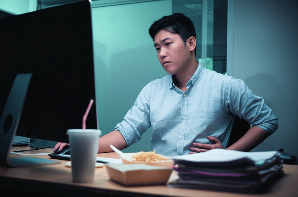 กลุ่มคนทำงานออฟฟิศมักเผชิญกับปัจจัยเสี่ยงหลายประการพร้อมกันโดยไม่รู้ตัว ไลฟ์สไตล์ที่ต้องนั่งทำงานเป็นเวลานาน, ความเครียดจากการทำงาน, การพักผ่อนไม่เพียงพอ และการเข้าถึงอาหารไขมันสูงและน้ำตาลสูงได้ง่าย ล้วนเป็นตัวเร่งให้เกิดการสะสมไขมันในตับ สภาวะเหล่านี้มักถูกเรียกรวมๆ ว่าเป็นส่วนหนึ่งของกลุ่มอาการ “ออฟฟิศซินโดรม” ที่ไม่ได้ส่งผลแค่กล้ามเนื้อ แต่ยังส่งผลกระทบต่อระบบเผาผลาญภายในร่างกายอีกด้วย ที่น่าเป็นห่วงคือ หลายคนอาจมีรูปร่างผอมหรือน้ำหนักตามเกณฑ์ แต่กลับมีภาวะไขมันพอกตับได้ เนื่องจากมีไขมันสะสมในช่องท้อง (Visceral Fat) ซึ่งมองไม่เห็นจากภายนอก
