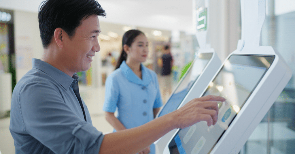นอกเหนือจากช่องทางออนไลน์แล้ว ยังมีการนำ “ตู้เช็คสุขภาพ AI” หรือ Kiosk ตรวจสุขภาพอัตโนมัติ ไปติดตั้งตามสถานที่สาธารณะที่มีผู้คนสัญจรเป็นจำนวนมาก เช่น ห้างสรรพสินค้า ศูนย์บริการของภาครัฐ หรือในพื้นที่ชุมชนต่างๆ ตู้เหล่านี้ถูกออกแบบมาให้ใช้งานง่าย ผู้ใช้สามารถทำตามคำแนะนำบนหน้าจอเพื่อตรวจวัดสัญญาณชีพพื้นฐานได้ด้วยตนเอง