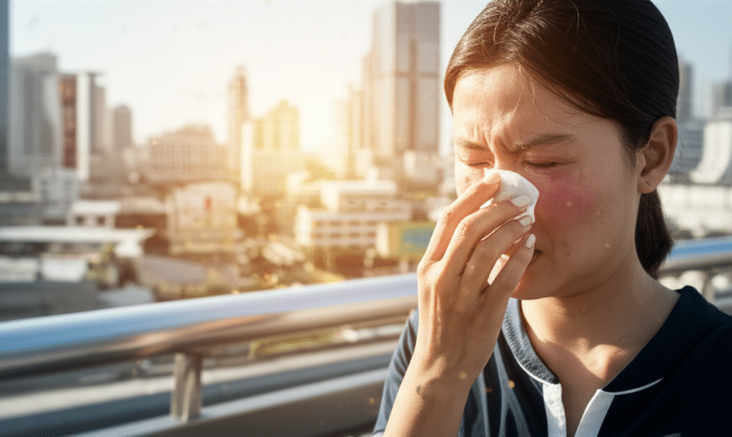 สาเหตุที่ปรากฏการณ์นี้น่ากังวลเป็นพิเศษ เพราะมันเป็น “ภัยคูณสอง” ต่อระบบทางเดินหายใจ ในด้านหนึ่ง มลพิษทางอากาศ เช่น โอโซนภาคพื้นดิน ไนโตรเจนไดออกไซด์ และฝุ่น PM2.5 ทำให้เยื่อบุทางเดินหายใจของมนุษย์เกิดการอักเสบและอ่อนแอลง ทำให้สารก่อภูมิแพ้สามารถแทรกซึมเข้าสู่ร่างกายได้ง่ายขึ้น ในอีกด้านหนึ่ง มลพิษเหล่านี้ยังสามารถเกาะติดกับผิวของละอองเกสร ทำให้โครงสร้างของเกสรแตกตัวและปลดปล่อยโปรตีนก่อภูมิแพ้ (Allergenic proteins) ออกมาในปริมาณที่มากกว่าและในรูปแบบที่เล็กกว่าเดิม ทำให้มันสามารถลอยอยู่ในอากาศได้นานขึ้นและเข้าสู่ปอดส่วนลึกได้ง่ายขึ้น ผลลัพธ์คืออาการภูมิแพ้ที่เคยเป็นเพียงเรื่องน่ารำคาญ อาจกลายเป็นอาการรุนแรงที่กระทบต่อคุณภาพชีวิตอย่างมาก