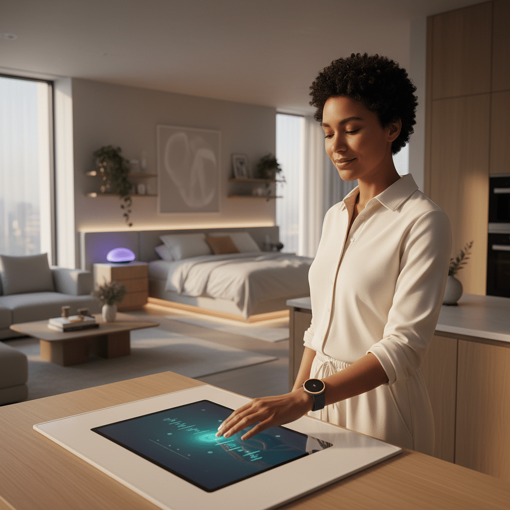 การประยุกต์ใช้: อุปกรณ์จะตรวจจับระยะการนอนหลับ (หลับตื้น, หลับลึก, REM) อัตราการหายใจ และการเคลื่อนไหวตลอดทั้งคืน เมื่อ AI ตรวจพบว่าผู้ใช้กำลังจะเข้าสู่ช่วงหลับลึก ระบบอาจค่อยๆ ลดอุณหภูมิห้องลงเล็กน้อยและเปิดเสียง White Noise เพื่อส่งเสริมการนอนหลับที่มีคุณภาพ หากตรวจพบรูปแบบการหายใจที่ผิดปกติ ระบบจะบันทึกข้อมูลไว้เพื่อสร้างรายงานให้ผู้ใช้นำไปปรึกษาแพทย์ นอกจากนี้ยังสามารถตั้งปลุกอัจฉริยะที่จะปลุกผู้ใช้ในช่วงที่ร่างกายกำลังหลับตื้น ทำให้รู้สึกสดชื่นกว่าการถูกปลุกในช่วงหลับลึก