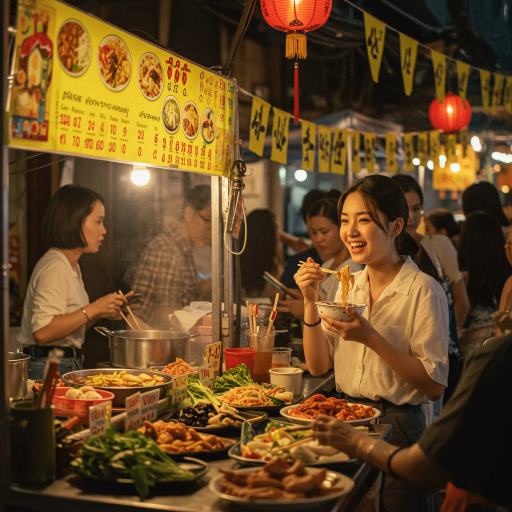 - สัญลักษณ์ของเทศกาล: มองหา “ธงเหลือง” ที่มีอักษรจีนสีแดงเขียนว่า “เจ” (齋) ซึ่งเป็นเครื่องหมายยืนยันว่าร้านนั้นจำหน่ายอาหารเจที่ถูกต้องตามหลักประเพณี
